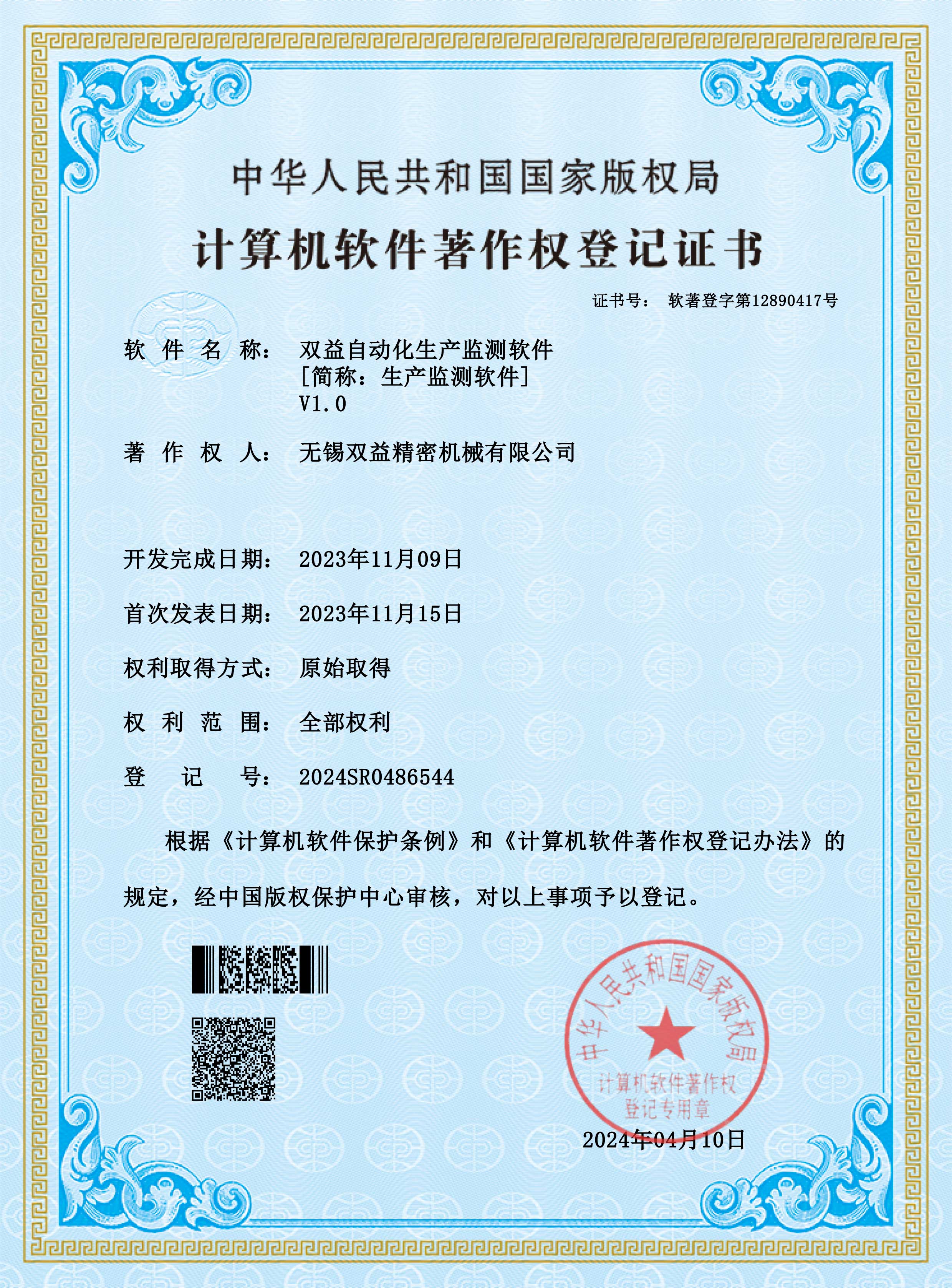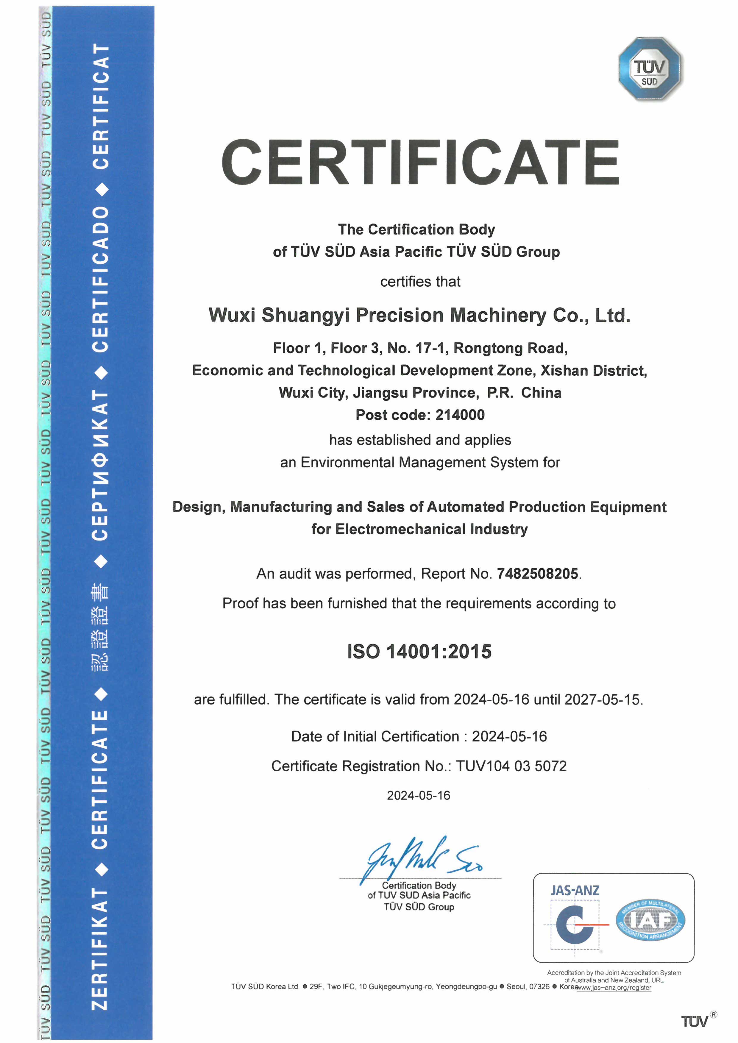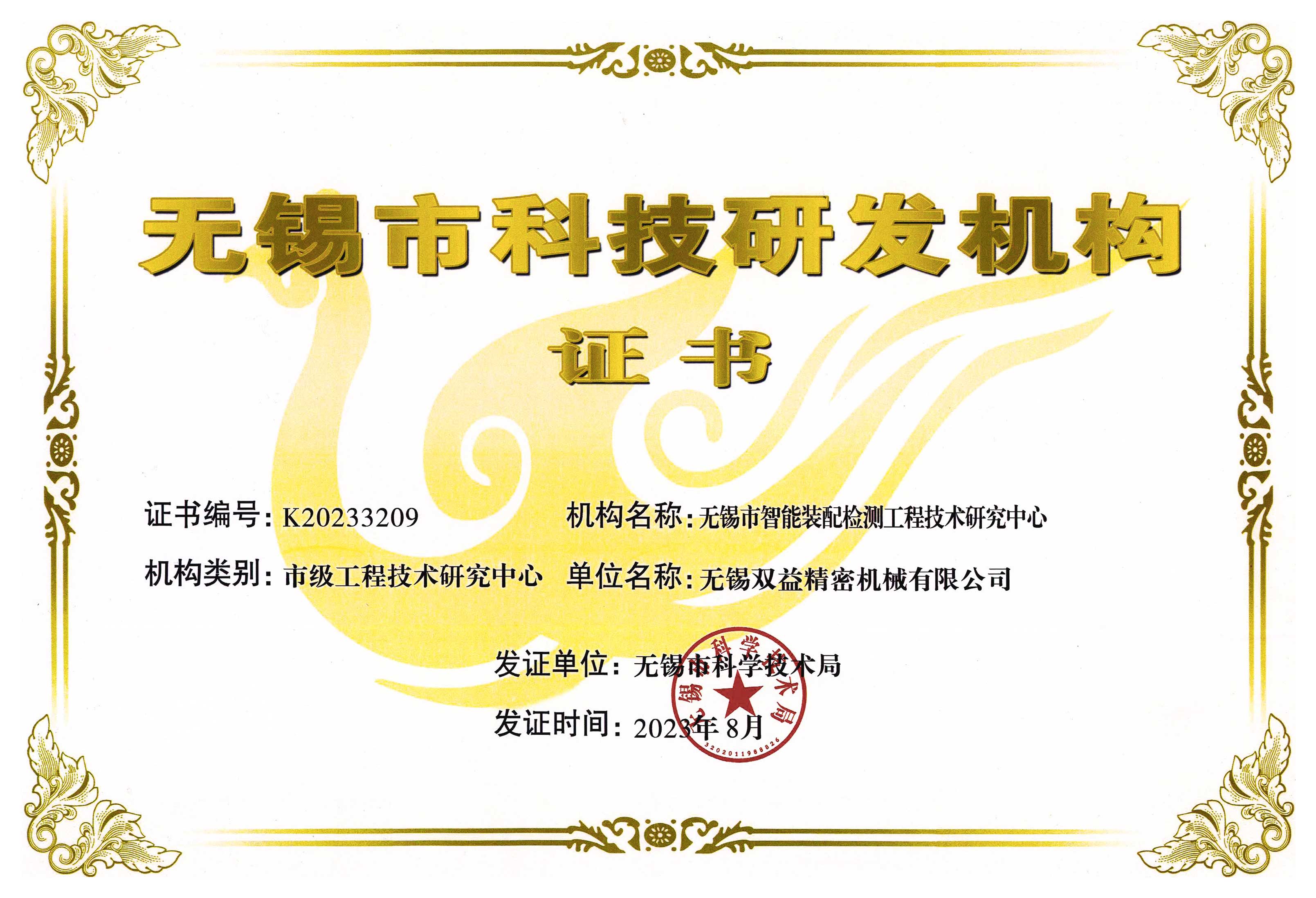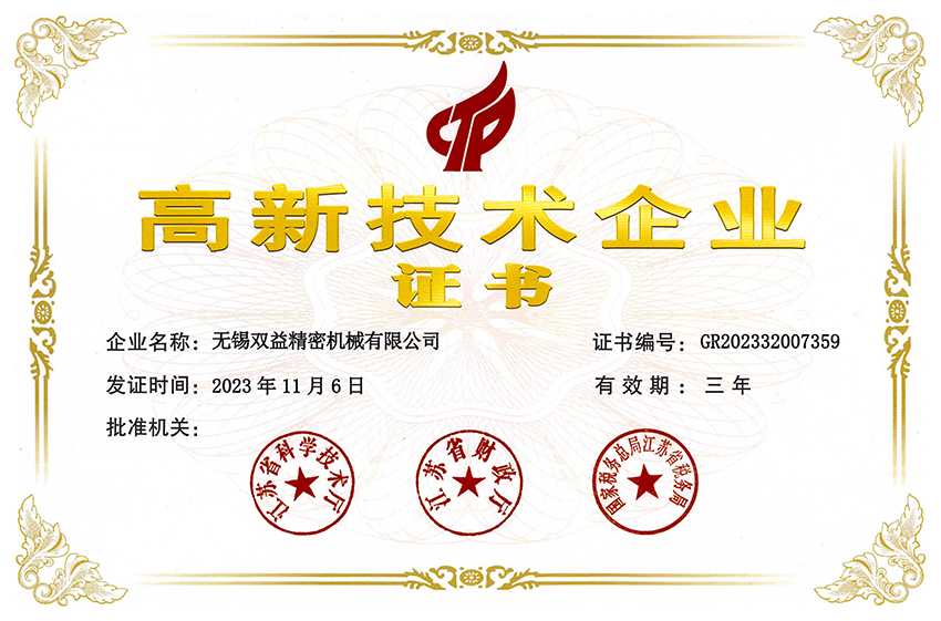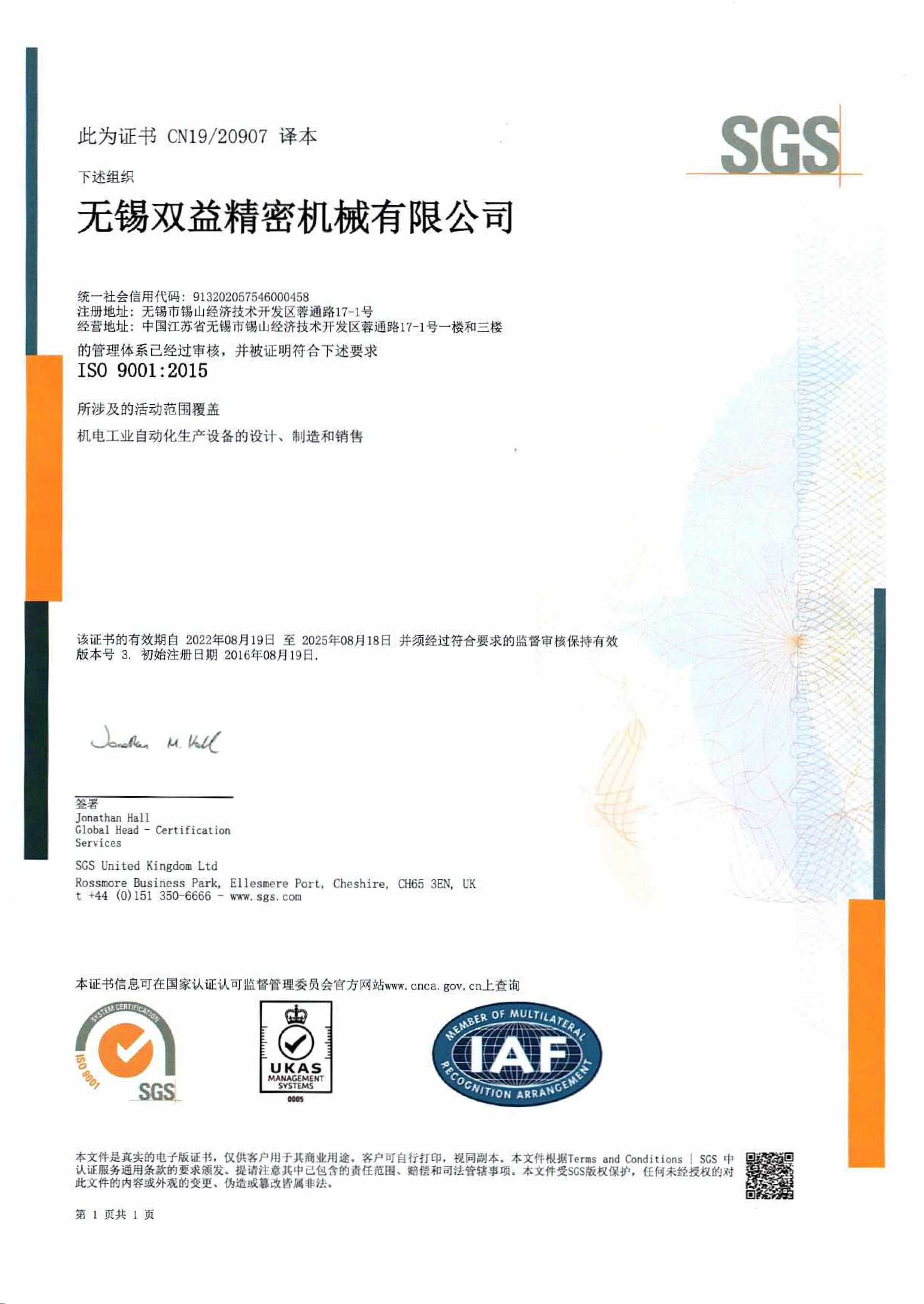 雙益精機高度重視品質(zhì)管理,已通過 S G S公司的質(zhì)量體系認證 ISO9001:2015、TUV公司的環(huán)境體系ISO14001:2015,職業(yè)健康安全 管理體系ISO14001:2015,能源管理體系IS050001:2018,以及知識產(chǎn) 權(quán)管理體系,為客戶提供安全、優(yōu)質(zhì)的產(chǎn)品。同時,公司多次被評選為 江蘇省民營科技企業(yè),并獲得江蘇省人民政府授予的《高新技術(shù)企業(yè)》 稱號。此外,雙益精機兩次榮獲浙江省科學技術(shù)進步二等獎,獲得江蘇 省專精特新企業(yè)稱號,同時被認定為市級企業(yè)技術(shù)中心和市級工程技 術(shù)研究中心,并被認定為市級保密試點單位。